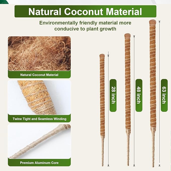 - Environmentally Friendly Material - The natural coconut palm fiber used in the outer layer, the breathable material helps the healthy growth of the plant, and the 7mm solid aluminum used in the inner core makes them very strong enough to support tall and heavy climbing plants, these moss pole monstera plant support will not rust in the soil for too long, will not break down, so they can be used for a long time.