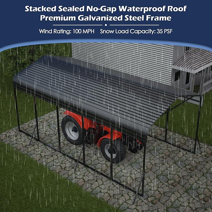 - 【All-Weather Protection】Constructed with heavy-duty alloy steel, the carport boasts galvanized frame and waterproof roof, shield your vehicle from harsh weather conditions such as scorching sun, hail and snowstorms. It is spacious enough to accommodate cars, trucks, tractors or boats, and serves as a carport canopy as well as a shelter for outdoor activities. Wind Rating: 100 MPH; Snow Load Capacity: 35 PSF