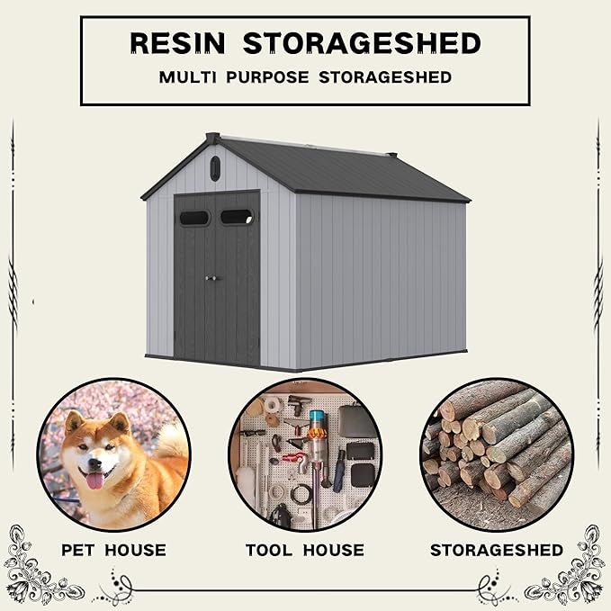 8x10 FT Outdoor Storage Shed with Hinge Door,Window & Air Vent,Outdoor Plastic Tool House W/Waterproof Tilted Roof,Heavy Duty Stroage Unit for Backyard,Patio,Lawn,Garden,Grey+Black