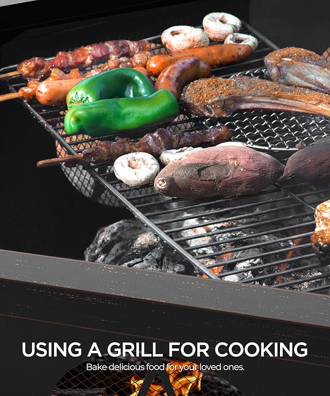 - 【VISUAL APPEAL & HUMANIZED STYLE】We have a cooking grill and a poker in our SUNOUTLY fire pit. You may cook with a pan on them, keep meals warm, or barbeque. When grilling, the poker is used to modify the wood fuel, which can help maintain a mild and even fire and encourage effective log burning.