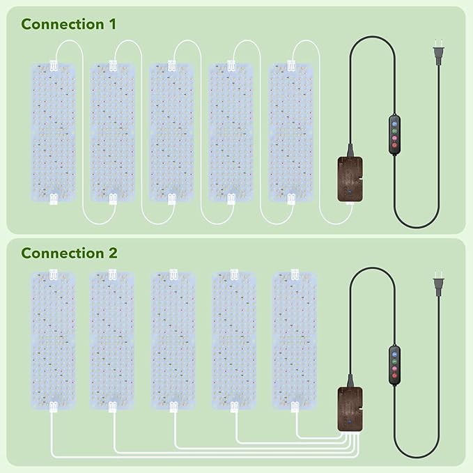 - [Modular LED Grow Panel with Daisy Chain Design] – This linkable grow light panel offers a professional solution for both hydroponic and green house. Easily connect up to 10 panels in series or parallel using the included 8.2ft power cord and 3.28ft link wires. Ideal for small to big indoor setups—whether a 3x3 or 4x4 grow tent, shelf, or commercial greenhouse.