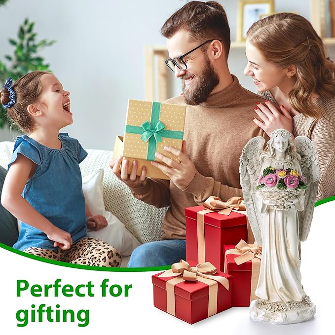 - Antique Finish with Lighted Flower Basket: The angel statue holds a flower basket containing five warm lights. The faux-aged surface and delicate detailing bring a sense of elegance and serenity, enhancing your solar garden decorations with vintage charm.