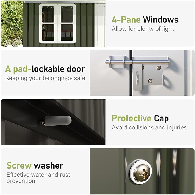 - Multi-Functional Use: The garden shed design is an ideal storage space for trash cans, tools, equipments, growing supplies, for all your storage needs