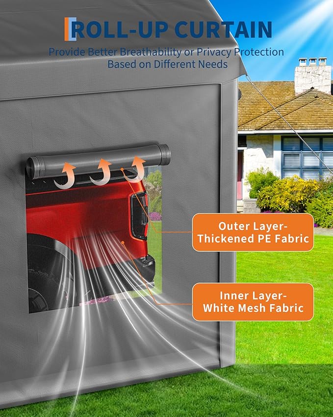 - [Optimized Climate Control] Four zippered roll-up doors and four mesh ventilation windows allow 360Β° air circulation and prevent condensation build-up. Breathable car awnings are designed to protect the vehicle from temperature fluctuations while minimizing interior space - essential for preventing rust on classic cars or machinery. Removable side panels can be customized for the season.