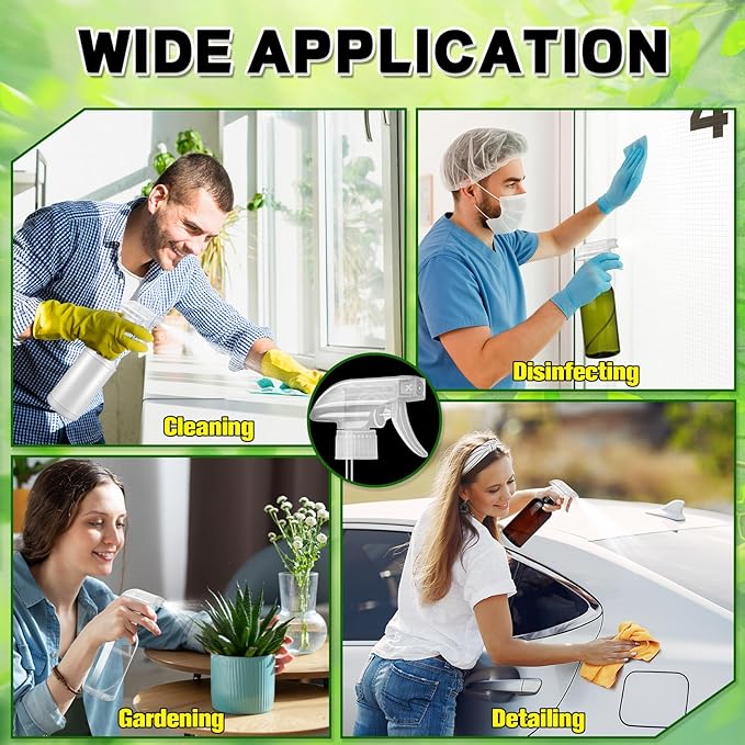 - Leak-Proof Design: Built with leak-proof gaskets and precision threading, our trigger sprayer heads create a tight, secure seal that helps prevent drips, leaks, and unnecessary waste during use. When not in use, twist the nozzle to the off mode to avoid accidental spraying and ensure clean, dry storage