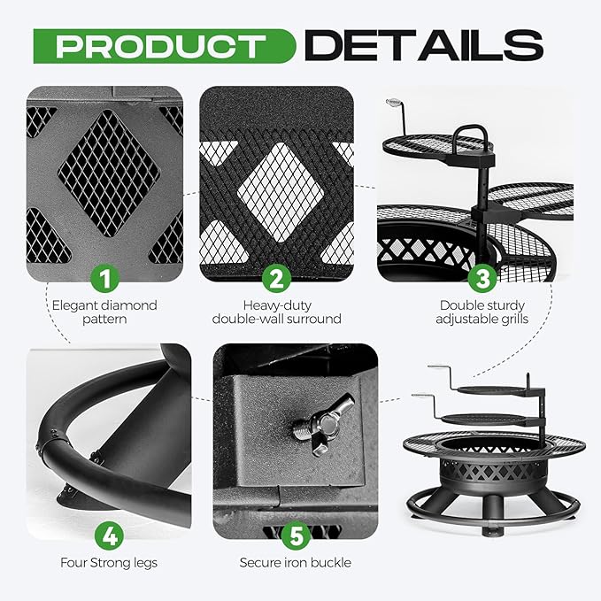 - 【Safety and Sturdy Fire Pit】Panovue wood burning 3-in-1 fire pit features a diamond-lattice perimeter.The striking design allow optimal airflow for robust fires while blocking embers from escaping.The outdoor fireplaces stand strong against the elements with its heavy duty iron frame and four robust legs connected by a circular support ring.The cylindrical legs aren’t just for balance—they’re designed with a slight outward angle to distribute weight evenly, preventing wobbling on uneven ground.