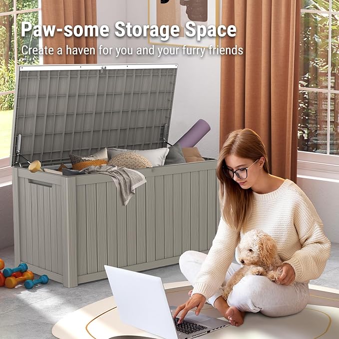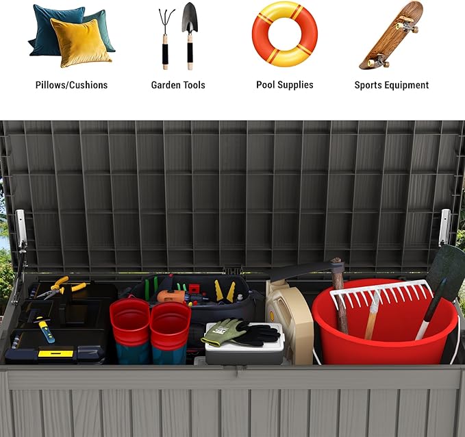 - 【Smooth & Secure Operation】- Equipped with dual side hydraulic hinges, the lid opens effortlessly and remains in place for easy access to your items. The slow-closing mechanism ensures safe operation for all family members, while the lockable lid (lock not included) provides an additional layer of security for your outdoor essentials