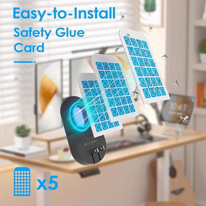 - 🧲 Easy to Use – Includes 5 Replaceable Glue Boards:Plug and play design—just insert into any standard outlet. The package includes 1 white fly trap device and 5 strong glue cards, ensuring long-lasting protection. A reliable indoor bug zapper alternative for a cleaner, bug-free home.