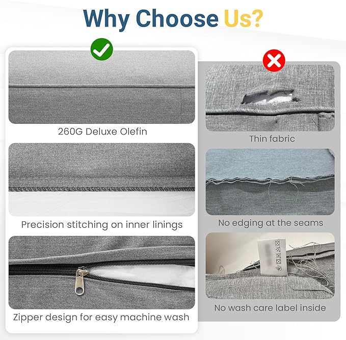 - Upgraded Cushions: This cushion, crafted from 260G deluxe Olefin fabric, blends style and functionality. With a color fastness rating of 5, its vibrant colors stay bright even after prolonged sun exposure. The soft, skin-friendly texture is ideal for homes with kids and pets, ensuring comfort and safety. Additionally, the precise stitching and high-quality inner lining showcase fine craftsmanship, adding elegance to every detail.