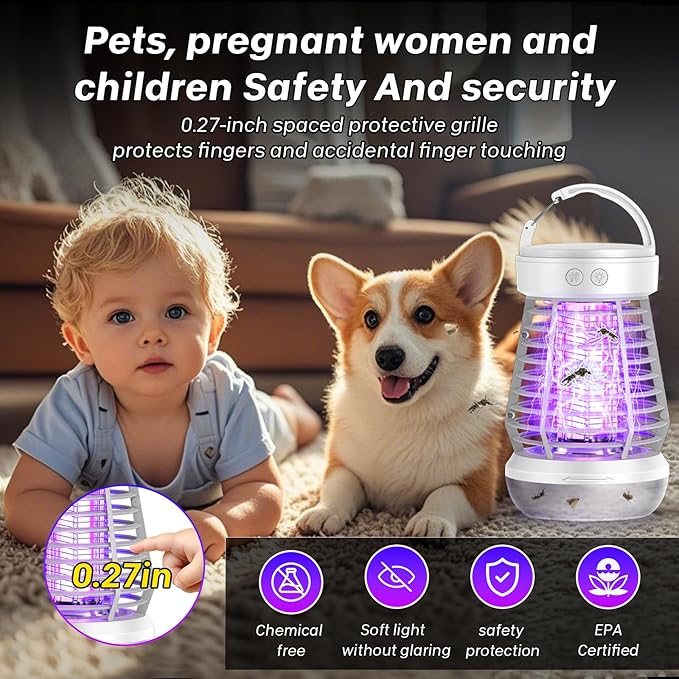- 【Warm Light & Purple Light, 3 in 1】This portable exterminator is a powerhouse of functionality, designed to not only eliminate pesky bugs but also provide desk lamp-level lighting. Whether you're at home or out camping, it effectively keeps flying insects at bay while doubling as a reliable camping ligh