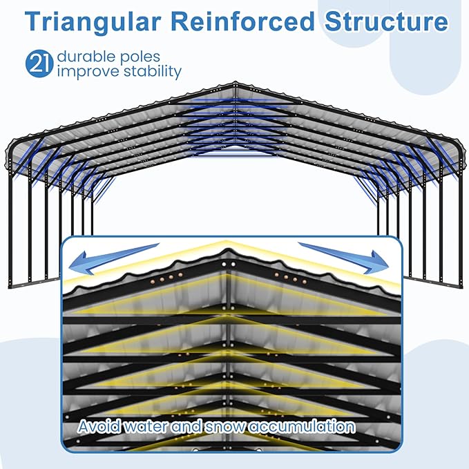 - Durability and Protection: Our carport features 21 reinforced cross beams, 14 rust-resistant powder-coated 2''x2'' steel poles, and a high-strength galvanized steel roof with 0.5 mm thick panels. The roof includes a drainage system for smooth runoff, and the joints are sealed with waterproof tape to prevent leaks