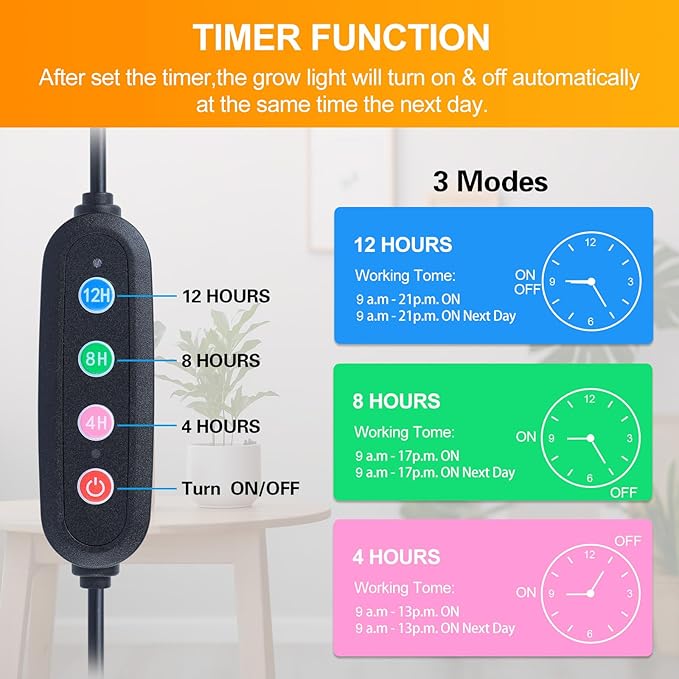 - Auto ON/OFF Every Day---4/8/12 Hr Timer. The plant grow light will auto ON/OFF every day. You can be easy to use this indoor grow light for bonsai, vegetables, seed starting, seedlings, flowering.