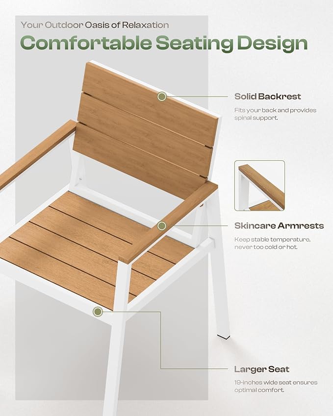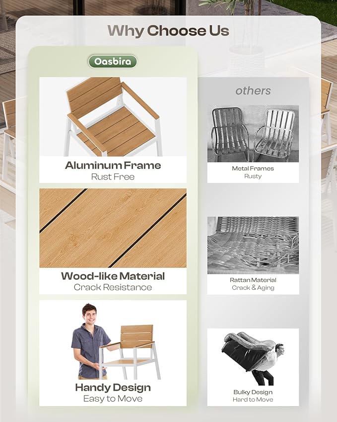 - 【Premium Materials】This patio dining set features an aluminum frame with weather-resistant coatings, which make it lighter and stronger than iron. Also, its HDPS wood-like panels are UV-resistant and fade-proof, ensuring long-lasting beauty. Compared to conventional metal furniture, Oasbira outdoor dining sets are more sturdy and ideal for outdoor use.
