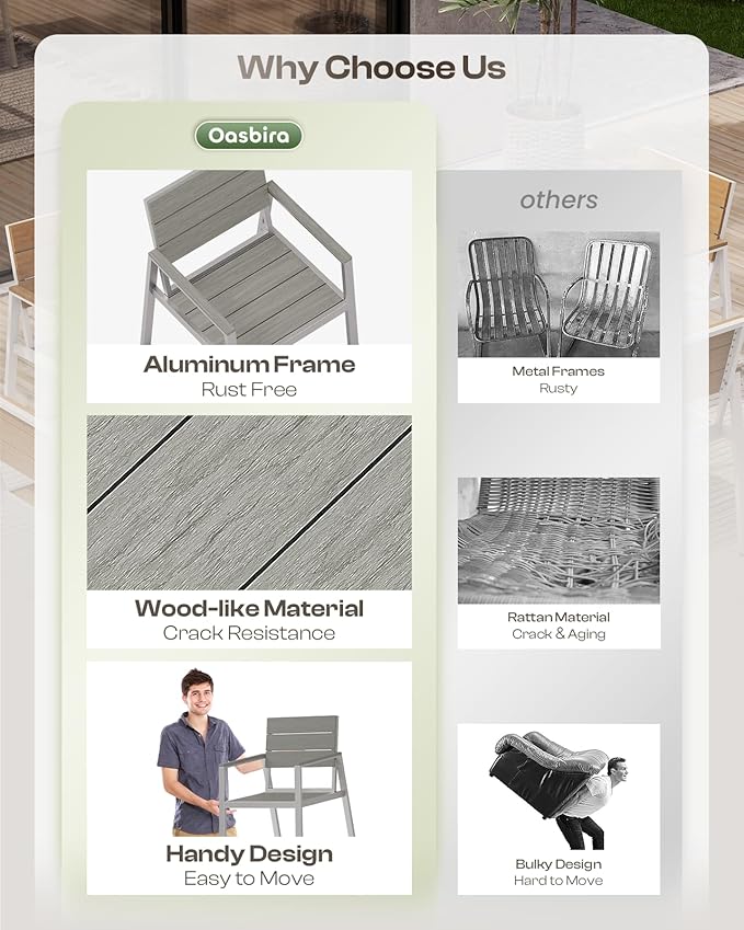 - 【Premium Materials】This patio dining set features an aluminum frame with weather-resistant coatings, which make it lighter and stronger than iron. Also, its HDPS wood-like panels are UV-resistant and fade-proof, ensuring long-lasting beauty. Compared to conventional metal furniture, Oasbira outdoor dining sets are more sturdy and ideal for outdoor use.