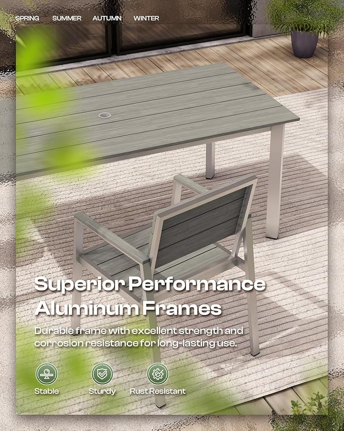 - 【Comfy and Spacious Dining Table Sets】This patio dining chair features a 19" W and 17.5" D, supporting up to 350 lbs, with patio dining table supporting 280 lbs. Skin-friendly HDPS surfaces maintain comfortable temperatures year-round, unlike metal, which absorbs heat and cold. This outdoor dining table has a 1.77" umbrella hole for easy setup, offering a more comfortable outdoor dining experience.