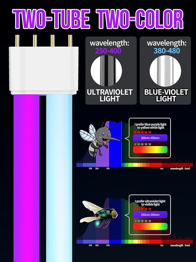- Dual-Wavelength Attraction – Features two-color light tubes that emit a broad spectrum of UV light, effectively luring mosquitoes, flies, and other pests for superior trapping performance.