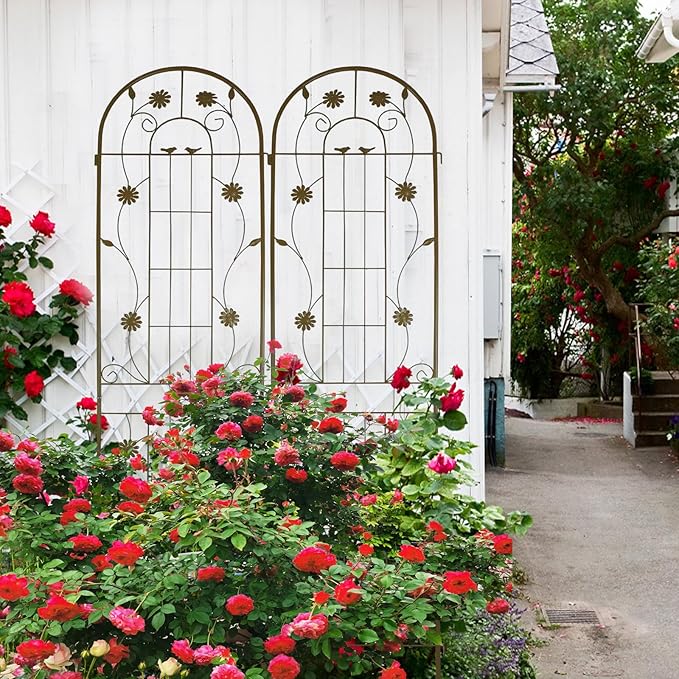 - Multi Purpose Garden Trellis: This outdoor garden trellis provides support for climbing plants, such as ivy, rose, cucumber. The brown garden metal trellis can be used to form privacy screens.