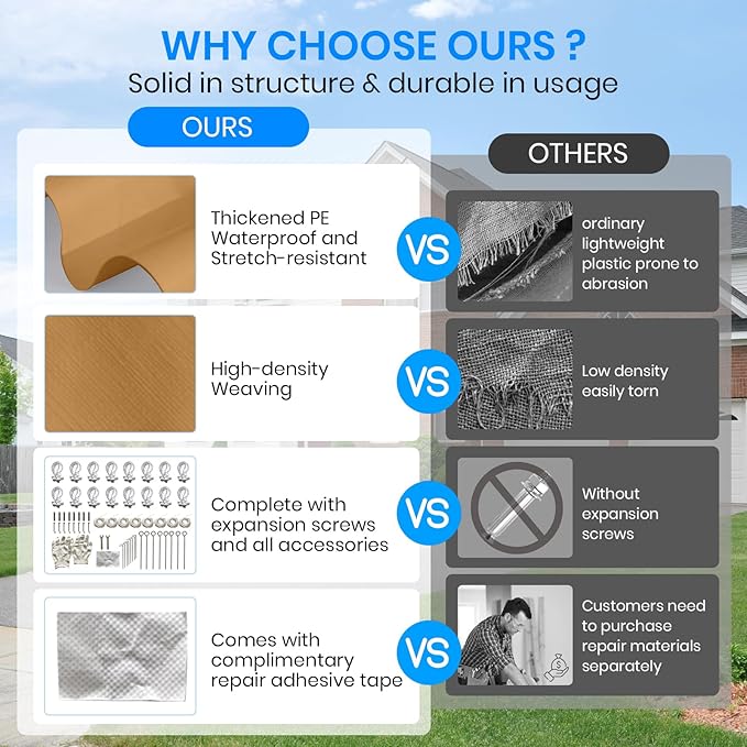 - 【Waterproof All-Season Car Canopy】This all-weather car canopy features a reinforced triple-layered 180g polyethylene fabric that is tear-proof, waterproof, and UV resistant. The sturdy canopy cover is securely attached to the frame using elastic ball bungees and buckles, ensuring reliable protection for your vehicle and other items throughout the year. Besides, bonus repair adhesive tape is included for any necessary cover repairs.