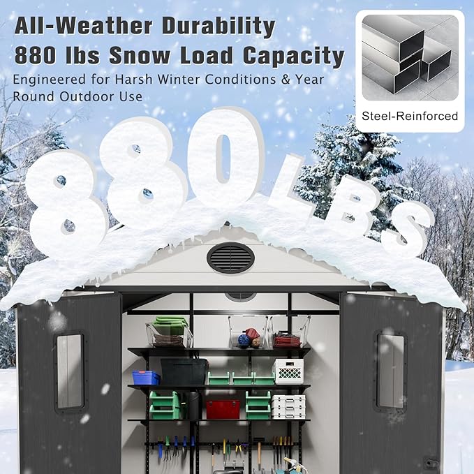 - ALL-WEATHER RESIN CONSTRUCTION: Built with 16mm thick dual-wall polypropylene panels reinforced by a powder-coated steel frame, this outdoor storage shed offers superior strength. Engineered to resist rain, UV rays, and rust while supporting up to 800 lbs of snow load