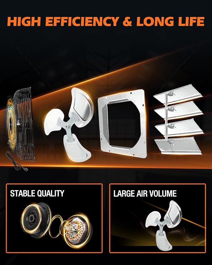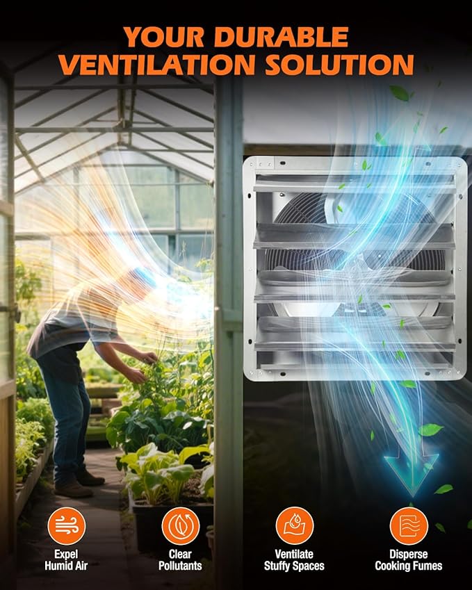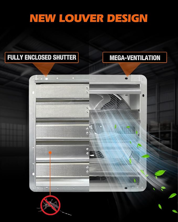- 【AUTOMATIC SHUTTERS & CORROSION-RESISTANT BUILD】:Durable aluminum shutters open/close automatically for seamless airflow and weather protection. Galvanized steel frame + aluminum blades resist rust and wear, making it perfect for high-moisture environments like greenhouses, welding shops, or motor rooms.