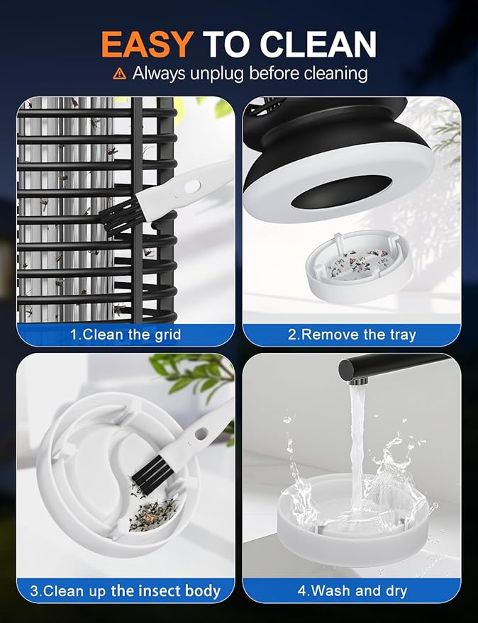 - PORTABLE & EASY TO CLEAN: Lightweight and compact, this outdoor mosquito control comes with a handy hanging ring for effortless portability—no assembly required! The detachable tray and included cleaning brush make maintenance a breeze. Simply remove dead insects and debris to keep your zapper running at peak performance. Less hassle, more zapping!