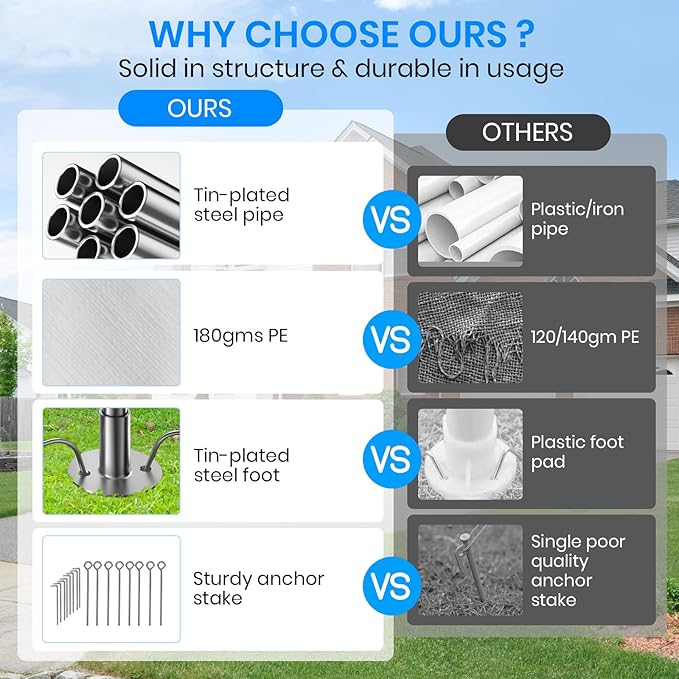- Multi-Purpose Protection:Not just for vehicles, this 10x20 FT carport is ideal for storing boats, RVs, motorcycles, and even as a shelter for outdoor events like parties, picnics, or gatherings. Its versatile design ensures it can adapt to various needs, providing reliable shelter wherever you need it.