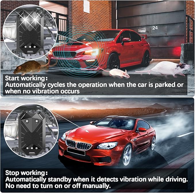 - INTELLIGENT VIBRATION SENSING: When a vibration signal triggers the circuit (the car starts), the mouse repeller stops working and the red indicator light is always on. The machine resumes working after 90 seconds when the working environment is stable (no more vibration)