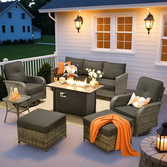 ovios 7 Pieces Patio Furniture Set, Outdoor Wicker Sofa Couch with Rocking Swivel Chairs Fire Pit Table, Modern Deep Seat Rattan Conversation Sets for Porch Deck, Black