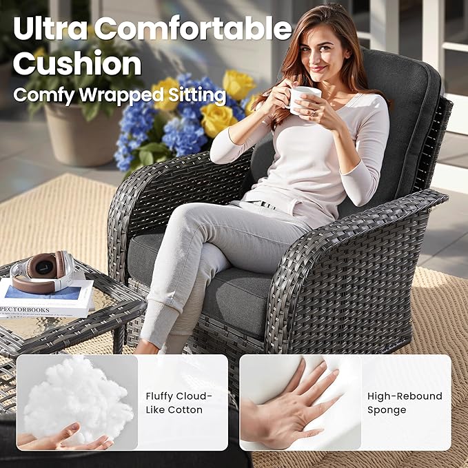 - 360° Swivel & 30° Gliding Rocking: The chairs feature a dual-function design: smoothly rotate 360° for effortless conversation or enjoy a gentle 30° gliding rock to relax and unwind, adding versatility to your outdoor experience. Ergonomic deep seating is designed for comfort, the spacious deep seats and wide armrests offer optimal support