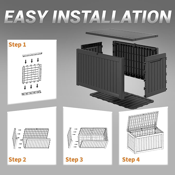 - 🎨 Modern Design, Blends with Any Décor With a sleek black finish, this patio storage box seamlessly integrates into any outdoor décor, including modern, rustic, or traditional styles. Whether used as a storage bench for extra seating, a waterproof deck container for garden tools, or a package delivery box, its versatile and stylish design makes it a great addition to porches, decks, and garages.