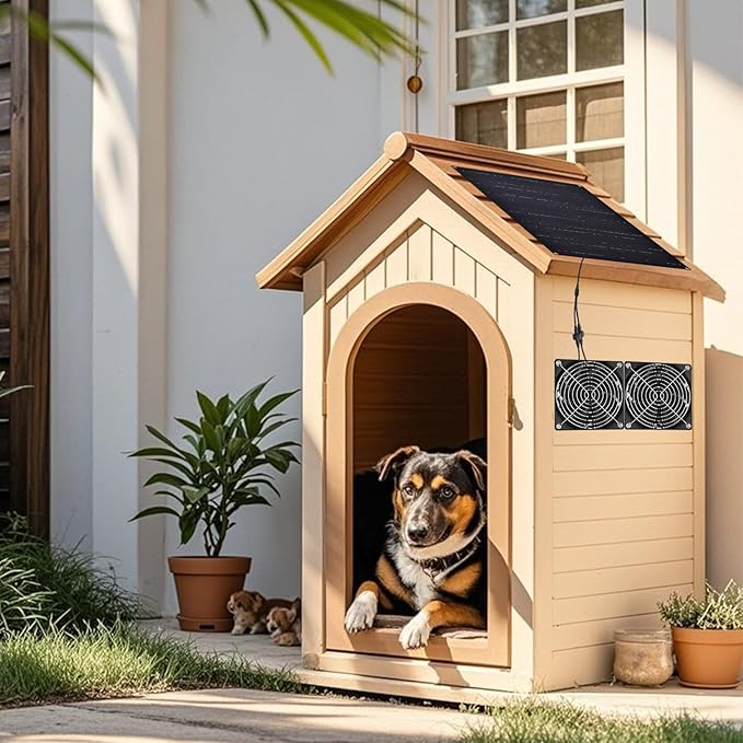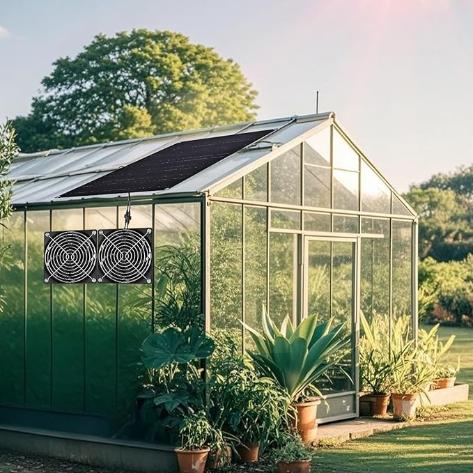 - Keep Space Cool and Fresh Air: The solar fan is the latest design with solar panel installation kit dual apart fan.Effectively enhances air circulation and helps cool down.The solar panel high efficiency fan kit is the ideal solution for greenhouse, chicken coop, shed, dog house, camping, outdoor, etc. cool and fresh air all the time.