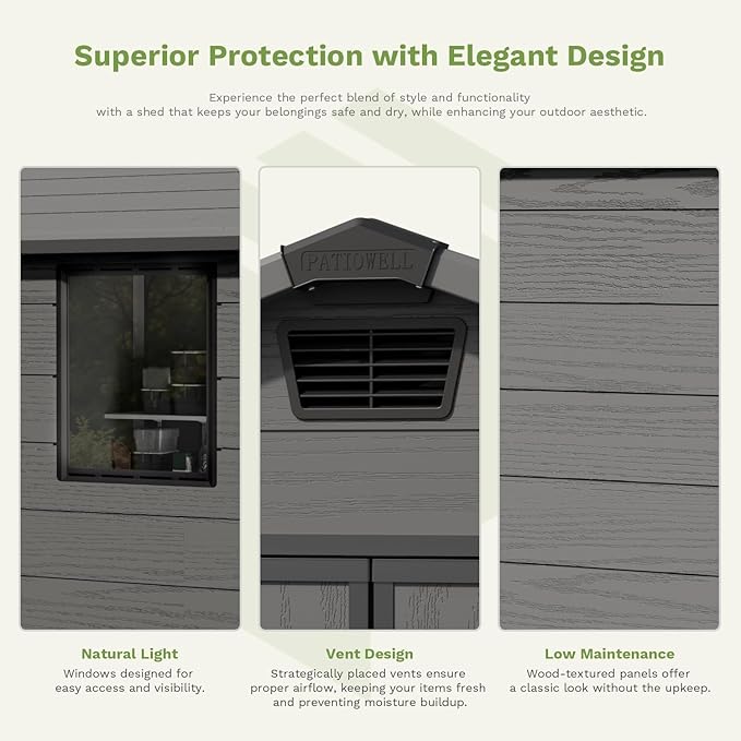 - Spacious & Versatile Storage: Measuring 72.6"L x 72.6"W x 83"H, the Patiowell 6 x 6 FT Shed offers 162 Cu.ft of ample space for garden tools, bikes, lawn mowers, and patio furniture. Its high ceiling and open layout maximize vertical and horizontal space, ideal for organizing bulky items while doubling as a greenhouse or pet shelter.
