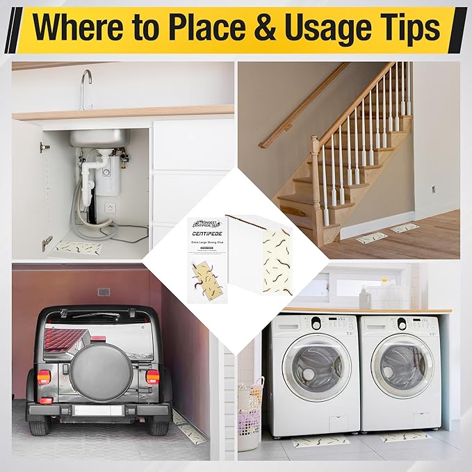 - Ready To Use & Maintenance Free: This pre scented centipede killer is scented with a special formula to attract insects, does not need to assemble or add bait, just tear off the protective film and place it, the flat design can be easily stuffed into the corners, place glue boards along known or suspected centipede pathways and refrain from touching or moving the trap, you can check and replace it regularly