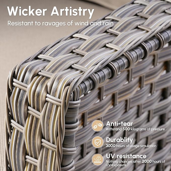 - Upgrade Your Outdoor Living: Experience unparalleled comfort with plush 3.5-inch thick cushions and thoughtfully designed ergonomic backrests in this elegant patio seating set. This durable wicker furniture combines style and functionality, making it perfect for cozy family moments or hosting guests. Whether placed on your patio, garden, poolside, balcony, deck, or backyard, this patio set transforms your space into a serene oasis for relaxation and entertainment. Elevate your outdoor retreat with a design that blends luxury and practicality