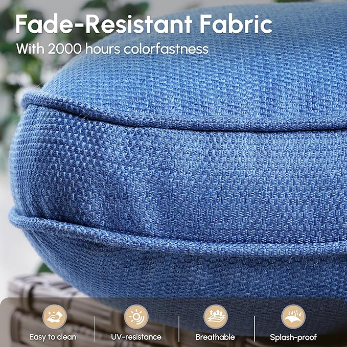 - Built to Last:This patio seating set is engineered for longevity and crafted with premium materials to ensure maximum durability. The robust metal frame is thicker than most, supporting up to 400 lbs, and features a premium-grade coating that resists scratches, peeling, and rust. The hand-woven all-weather PE wicker is built to withstand rain, tears, and fading, ensuring it looks fresh season after season. Additionally, the premium cushion fabric uses advanced 100% solution-dyed technology, making it highly resistant to water, spills, and stains while keeping colors vibrant for years. This set combines style and durability for a long-lasting outdoor retreat