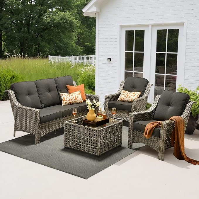 - Upgrade Your Outdoor Living: Experience unparalleled comfort with plush 3.5-inch thick cushions and thoughtfully designed ergonomic backrests in this elegant patio seating set. This durable wicker furniture combines style and functionality, making it perfect for cozy family moments or hosting guests. Whether placed on your patio, garden, poolside, balcony, deck, or backyard, this patio set transforms your space into a serene oasis for relaxation and entertainment. Elevate your outdoor retreat with a design that blends luxury and practicality