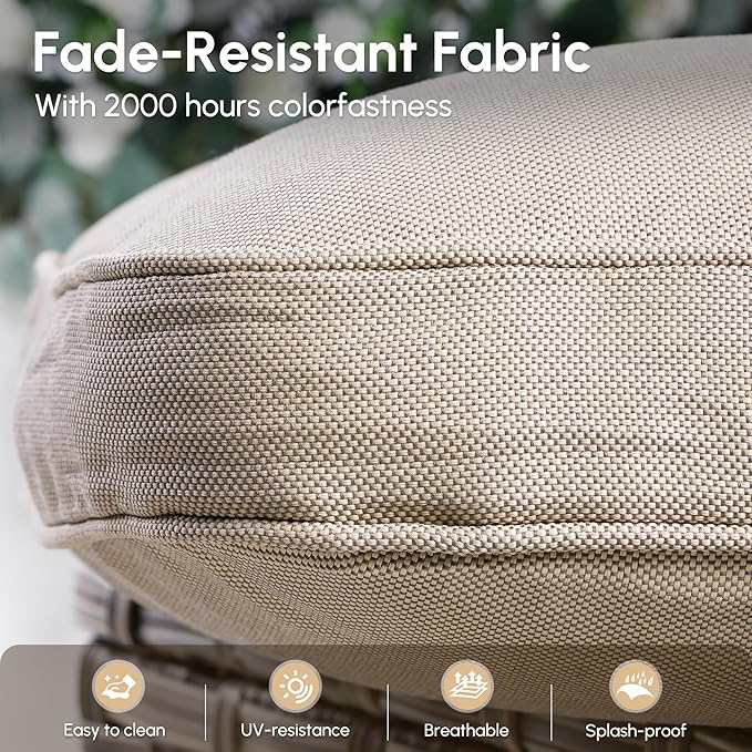 - Built to Last:This patio seating set is engineered for longevity and crafted with premium materials to ensure maximum durability. The robust metal frame is thicker than most, supporting up to 400 lbs, and features a premium-grade coating that resists scratches, peeling, and rust. The hand-woven all-weather PE wicker is built to withstand rain, tears, and fading, ensuring it looks fresh season after season. Additionally, the premium cushion fabric uses advanced 100% solution-dyed technology, making it highly resistant to water, spills, and stains while keeping colors vibrant for years. This set combines style and durability for a long-lasting outdoor retreat