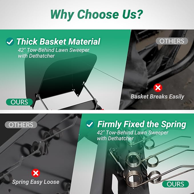 - Durable & Space-Saving Design with Support: The Tow-Behind Lawn Sweeper with Dethatcher features rust-resistant steel tines for lasting dethatching performance. Its foldable frame allows upright storage in garages or sheds, helping save space without losing durability. Backed by responsive customer service, this sweeper ensures a smooth ownership experience beyond the initial purchase.