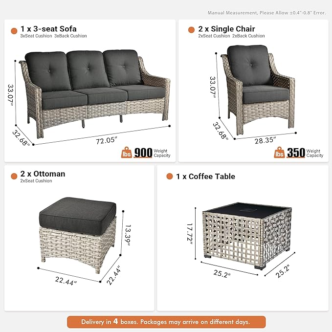 - Low Maintenance: Enjoy the ease of assembly with this patio furniture, complete with all the tools you need. The weather resistant materials make maintenance a cinch, while the splash proof design keeps your patio outdoor sset and sofa set looking fresh