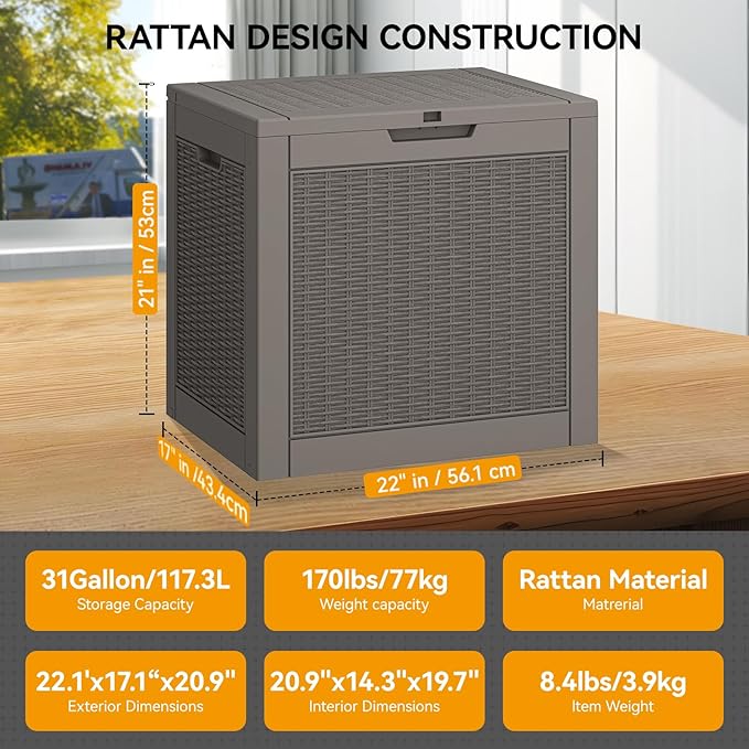 - Immense Storage Capacity: With dimensions of 22.1in x 17.1in x 20.8in, this deck box offers perfect storage space for all your outdoor essentials. It can hold up to 31 gallons of garden tools, pool supplies, patio furniture, cushions, and more.