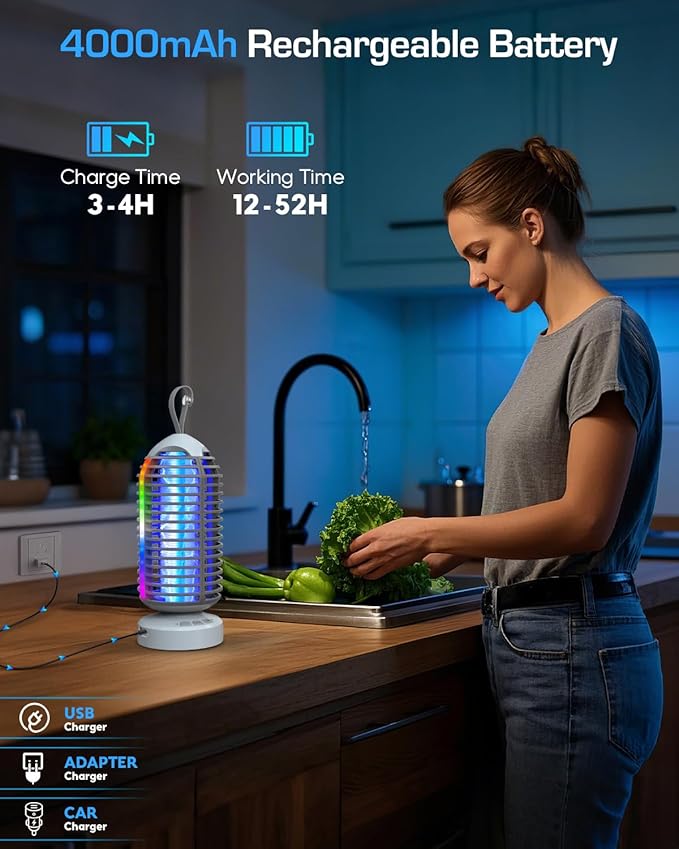 - Rechargeable 4000mAh Battery: This indoor fly zapper features a high-capacity 4000mAh battery, offering extended runtime: 12–16 hours in mosquito light mode, 7–18 hours in night light mode, and 17–52 hours in ambient light mode.With quick USB-C charging, it takes just 3-4 hours to fully recharge. Enjoy the freedom of cordless operation—whether at home or on the go, its portable, cordless design ensures continuous mosquito protection, letting you sleep peacefully without interruption.