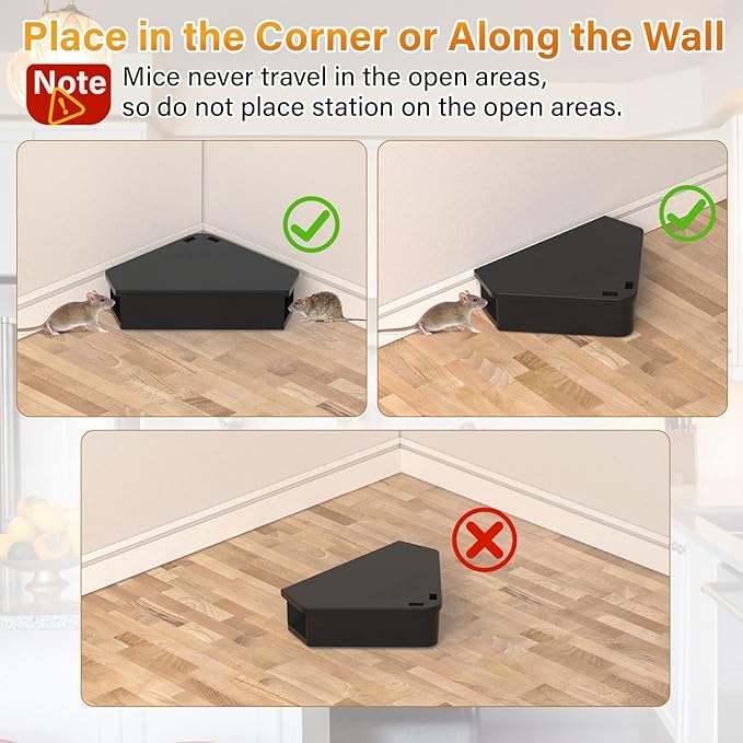 - 【Scientific & Effective Design】Our Mice station is designed with triangular shape and its low profile makes this station ideal for storing in tight spaces, corners, and under furniture. What's more, a tightly sealed lid keeps safe.