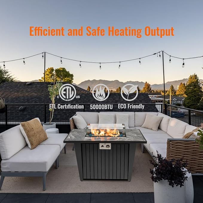 - 🔥🔥【Glass Wind Guard】It is firepit table for propane. Our fire pit tables for outside patio are subjected to a mail-order drop test and 100% ignition test. When the fire pit is heating which will produce 50,000BTU, We use glass wind guard to keep the flame safe and beautiful.