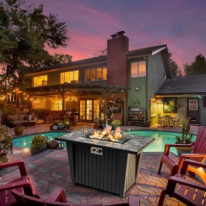- 🔥🔥【What you can get from it】This fire pit tables for outside patio with Marble tabletop, Fire pan and Stainless Steel burner, Gas regulator, Pulse Ignition, Safety thermocouple, all assembled, and Glass Wind Guard , Decorative Mixed color Glass Rocks, Waterproof Cover, Steel Lid.