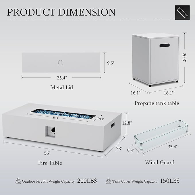 - 【56 inch Gas Fire Pit】This propane gas fire pit measures 56 x 28 x 12. 8 inches and is powered by clean-burning propane fuel, with plenty of glass rocks covering the surface to add beauty. Equipped with a gas tank cover table that can be set up in less than 15 minutes, the fire pit table can keep burning for 8-10 hours with the fitment of a standard 20-pound propane tank (not included)