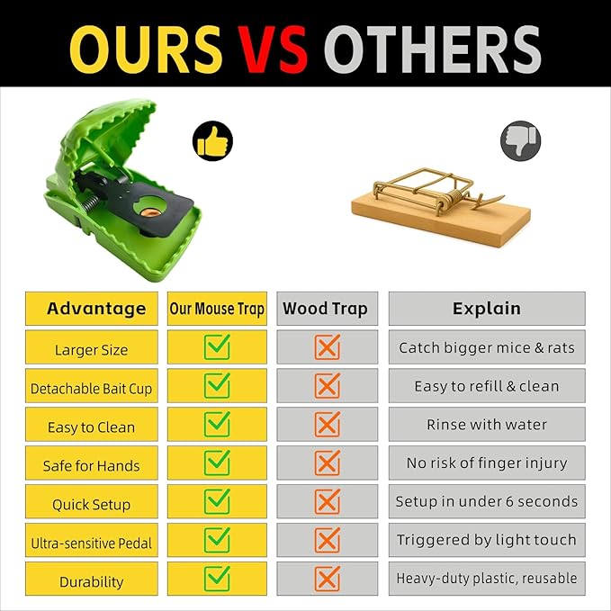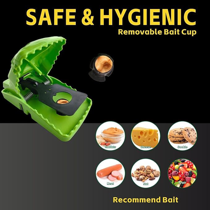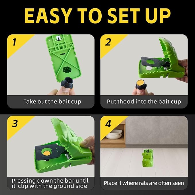 - No Assembly Required – Ready to Use: The trap arrives fully assembled. Just place bait in the cup, press to set, and position it along rodent pathways. No tools or complicated setup needed