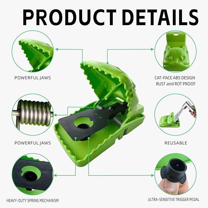 - Reusable and Durable Design: This mouse trap is built with sturdy ABS plastic and stainless-steel spring. Easy to clean and reset, it can be reused for long-term rodent control