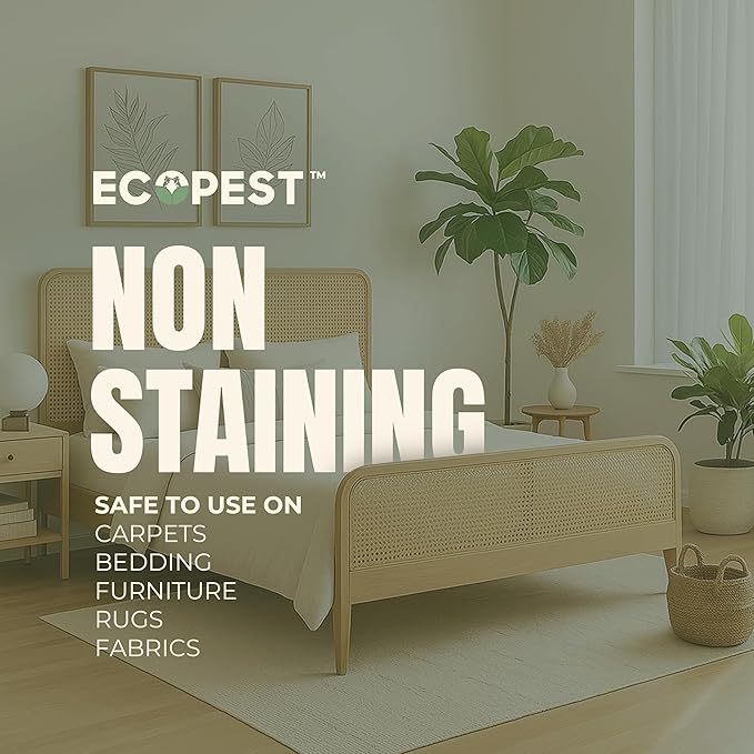 - NON-TOXIC, NON-STAINING & RESIDUE-FREE – Safe to use on water-safe surfaces like mattresses, bed frames, bedding, furniture, carpets, floors, and baseboards. Unlike chemical sprays that stain or leave harsh residues, our formula contains no dyes, no artificial fragrances, and won’t damage fabrics or finishes. Designed for bedrooms, living rooms, and other sleeping areas where bed bugs hide. Gentle on your home, lethal to bed bugs.