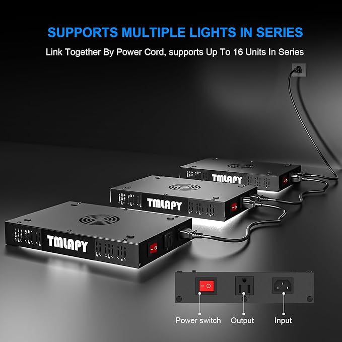 - 🌞【DAISY CHAIN FUNCTION】Our full spectrum grow light has daisy chain function. Attached with a 5ft daisy chain cable can be used to connect multiple lights together, but the total power in series cannot exceed 1000W.