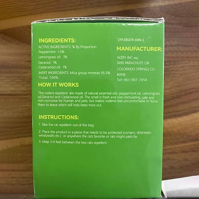 - Item Form : 1. the active ingredients is: Peppermint: 0.15% Lemongrass oil: 0.1% Geraniol: 0.1% Cedarwood oil: 0.1% Inert Ingredients: Mica group minerals: 95.5% Totol: 100% 1. the active ingredients is: Peppermint: 0.15% Lemongrass oil: 0.1% Geraniol: 0.1% Cedarwood oil: 0.1% Inert Ingredients: Mica group minerals: 95.5% Totol: 100%
